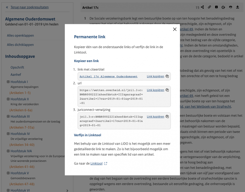 De popup op wetten.nl om een permalink te maken, toont ook een link naar de “Linktool”. Deze tool is bedoeld voor gevorderde auteurs met specifieke link-wensen. De linktool is een toepassing naast wetten.nl en maakt het mogelijk om diepe links naar artikelen en leden van een regeling te maken, en hierbij eventueel ook voorgaande versies van artikel uit te kiezen. De linktool maakt net als wetten.nl Juriconnect links aan met een passende citeertitel die direct naar Word kunnen worden gekopieerd.