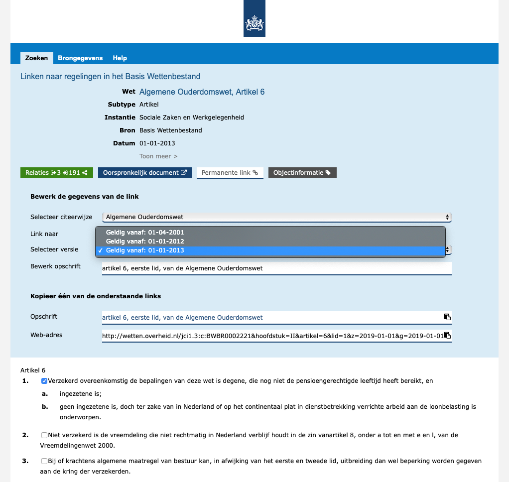 De link die een auteur via wetten.nl maakt is standaard voorzien van een geldigheidsdatum. Dit betekent dat de link altijd blijft verwijzen naar de versie van de regeling die de auteur op het scherm heeft staan. Deze versie van de regeling wordt een “toestand” van de wet genoemd. Voor elke bekendgemaakte wijziging van een regeling bestaat op wetten.nl zo’n toestand. De toestanden van elke regeling zijn beschikbaar tot het jaar 2002 terug. Naar al deze toestanden en de onderdelen in de toestand kan met een link worden verwezen.