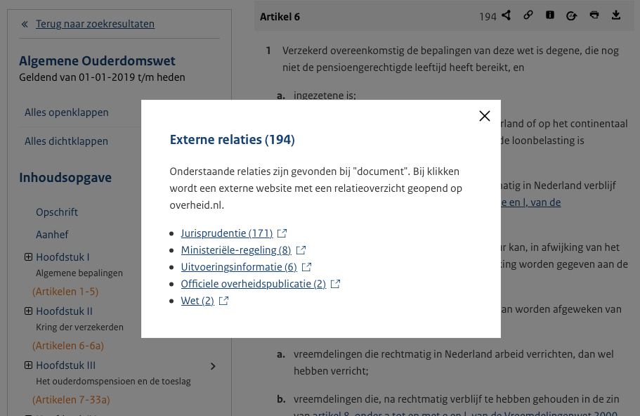 De klikbare links in publicaties worden door slimme software gebruikt om relaties tussen documenten af te leiden. Zo toont wetten.nl bijvoorbeeld bij elk regelingonderdeel ook welke relaties in jurisprudentie, beleid en andere regelingen zijn gevonden die verwijzen naar het betreffende regelingonderdeel. Wetten.nl toont bij elk regelingonderdeel hoeveel relaties per soort publicaties zijn gevonden. In onderstaande afbeelding zijn de relaties bij Artikel 6 Algemene Ouderdomswet opgevraagd door op het relatie-symbooltje en getal (